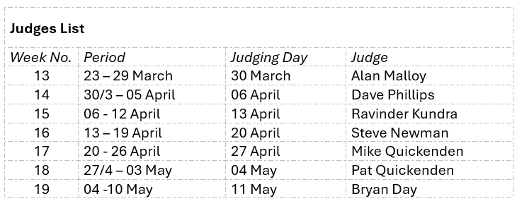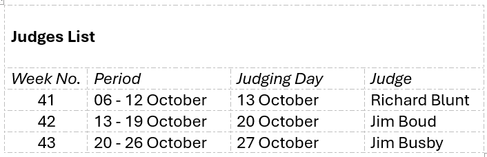 The Image of the Week will be judged the following Monday by an invited Club Member, selected alphabetically.